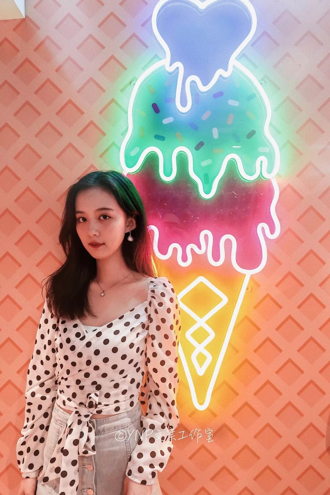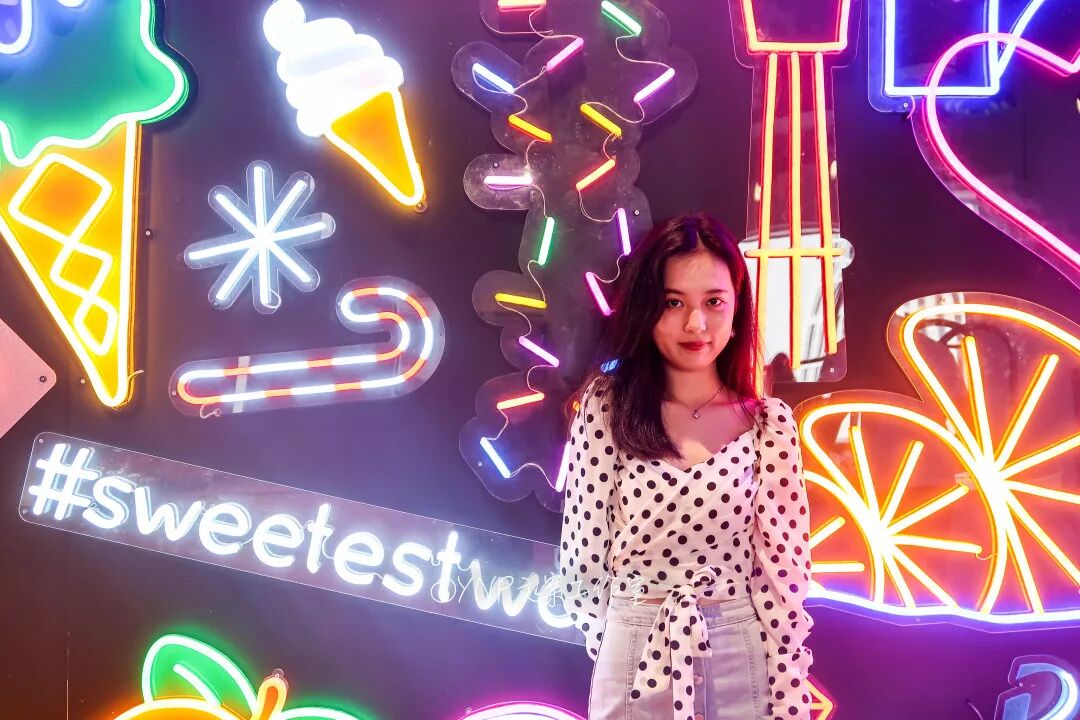 尤其是侧面或者斜侧站在这道霓虹灯墙前面,可以达到左右灯光色调一边粉黄一边粉蓝的效果,特别又香港老电影里面在夜晚街道的韵味。