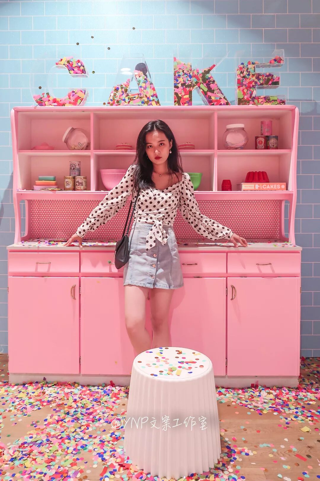 蛋糕后面有楼梯,可以爬到最顶上,旁边也有很多彩色小圆条,拍照的时候可以高高扬起,然后抛下,有一种很梦幻的感觉,比较考验摄影师的技术哈哈!
