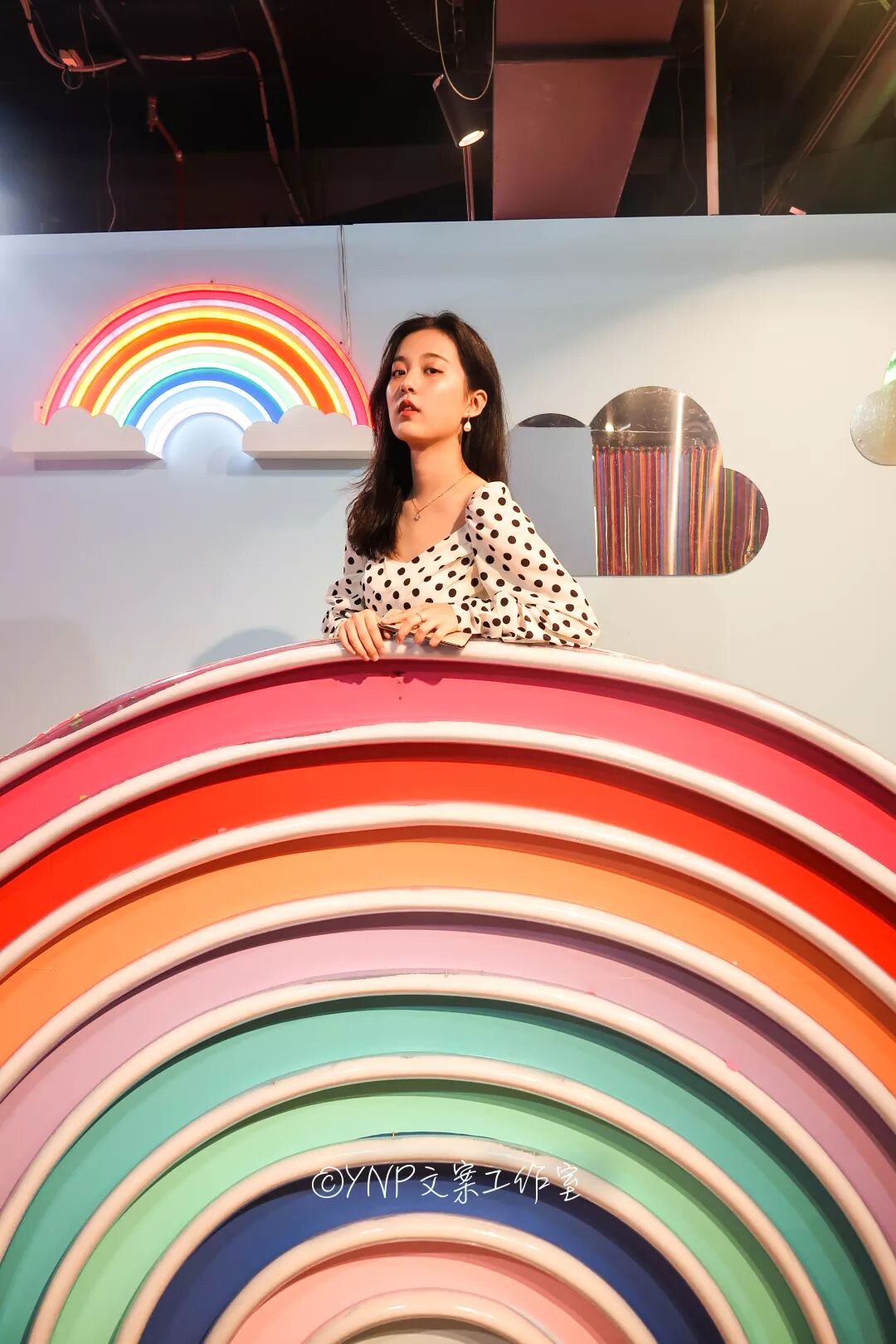 巨大的彩虹糖出片也是很快!淡蓝色的背景,亮起的LED灯,代入感真的很强,犹如在彩虹桥上漫步,对面的云朵镜子反射出来的人有一种复古风情,忍不住多拍几张!