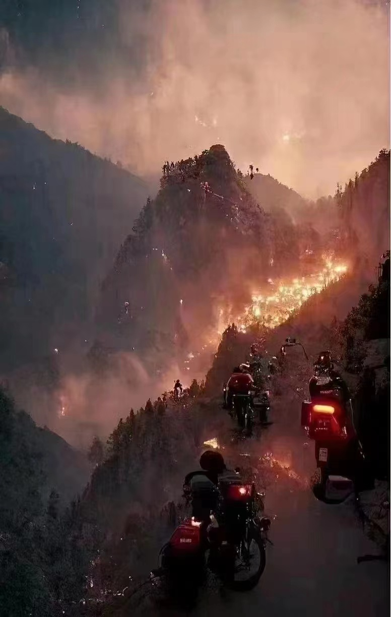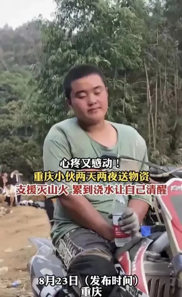 前方是消防官兵顶着高温持续作战,后面是重庆娃儿们的摩托队奋力运送物资。