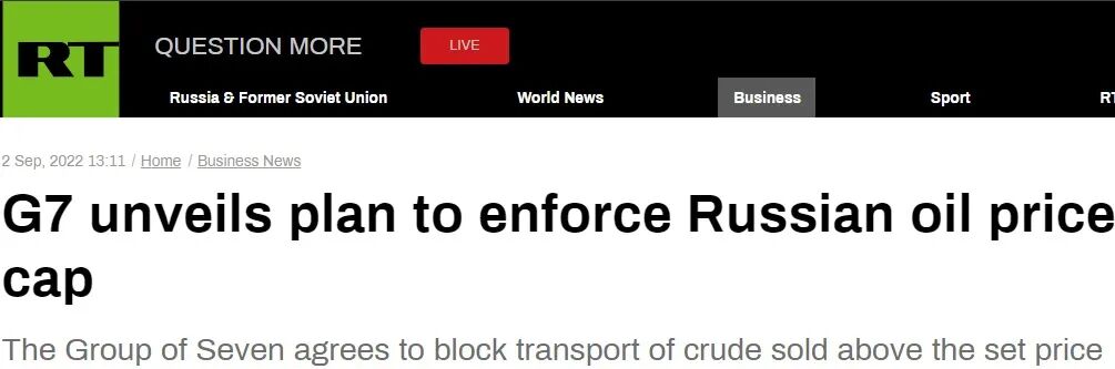 9月2日,七国集团(G7)财长对俄石油限价达成协议,目的有两个:一、给全球能源价格施加下行压力,确保俄石油以较低价格流动;七国集团宣布对俄石油限价计划。图片来源:“今日俄罗斯”报道截图两个月前甚至更早,美国及其盟国就打算对俄石油限价,参照边际生产成本以及俄乌冲突爆发前的油价,打算将俄油价限定在每桶40至60美元左右。其一,此举违背市场运转规律,市场不看好这样的机制。其二,如这一机制执行不力,效果可能适得其反,促使能源价格进一步飙升。其三,西方咄咄逼人可能激化形势,导致俄方直接断供,能源危机进一步恶化。G7决定限价当天,俄天然气工业股份公司(简称俄气)宣布,在与涡轮机制造商西门子公司代表共同对“北溪-1”管道涡轮机检修时,发现多处漏油,原本三天维修,变成了“直至故障排除”的无限期停气。德国政府提出质疑。按西门子公司的说法,“漏油”可以解决,“这不是停止运作的技术原因”。德方认为,莫斯科以此将天然气供应“武器化”。俄总统新闻秘书佩斯科夫则警告,G7的计划“十分荒谬”,将导致石油市场严重不稳定。对于支持限价的“不友好国家”,俄将停止供油,并向按市场条件运行的国家输油。俄总统普京已经指出,G7限制从俄进口石油和限价等提议,只能导致油价像天然气价格一样飙升。