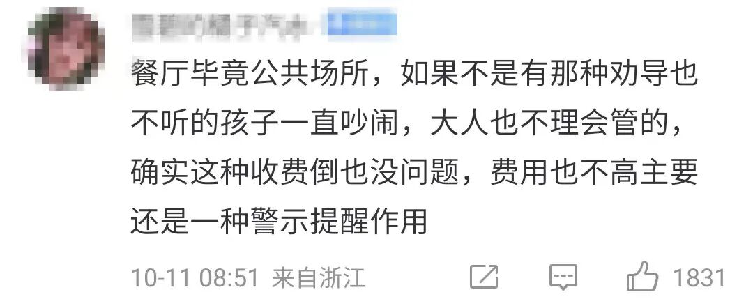 这家名为Angie's Oyster Bar & Grill的餐厅,针对“带有吵闹孩子的家庭”收取10新加坡元(约等于50元人民币)的额外费用,并将其名为“Screaming Children Surcharge”(尖叫儿童额外收费)。餐厅表示,这并不代表餐厅不欢迎小朋友,而是“为了保证其他客户的用餐体验,孩子们‘尖叫吵闹’或者‘不受控制’的行为将不会被容忍。”该餐厅之所以推出这一新政策,是因为餐厅员工已多次收到有关“儿童发出噪音、打扰其他顾客就餐”的投诉,因此才决定用“额外收费”来吓退一部分熊孩子家长(宁可不做这笔生意)或者让家长上点心。有人表示大力支持,希望能得到普遍推广。毕竟餐厅的收费也不高,主要是起到一种警示作用。也有不少网友提出反对意见,认为这是对有孩子家庭的歧视。“吵闹是孩子的天性,不能这么抑制。”而且,“家长交了钱,孩子会不会更加理直气壮地吵闹?”此外,还有网友一针见血地指出,吵闹的标准如何衡量?如果吵闹的孩子需要收费,那么吃饭大声吆喝的成年人更应该被收费。也有网友给出了其他解决办法:“建议餐厅搞个带孩子专区,不然餐厅收费,食客还是受罪。”2019年,爱尔兰都柏林的白麋咖啡馆(The White Moose Café)在社交网站上贴文表示,针对在餐厅尖叫的小孩,要多收取15%“尖叫费”。此外,店家还明确规定,孩童上限为4人,超过4名小孩,全家将被请出该咖啡厅。此新闻也曾引发网友热议。许多网友表示,不光在餐厅,高铁列车和飞机上也都遇到过“熊孩子”大声打闹的情况,但并没有具体应对办法。人们对“熊孩子”的行为不满,更多是对其背后的家长不满——对孩子打扰他人、扰乱公共秩序的行为坐视不理,还总想着找理由推脱。与靠外力约束相比,父母应更注重日常教育,自己也应当身体力行,这样,才是真正地“为了孩子好”。