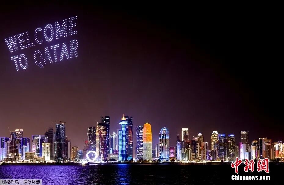多哈天际线上方出现了一场带有欢迎词的无人机表演。