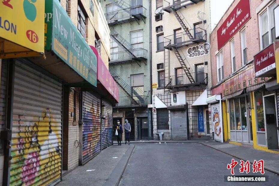 资料图:当地时间2020年4月12日,受新冠肺炎疫情影响,平日喧嚣的纽约曼哈顿唐人街商铺大门紧闭,行人稀少。