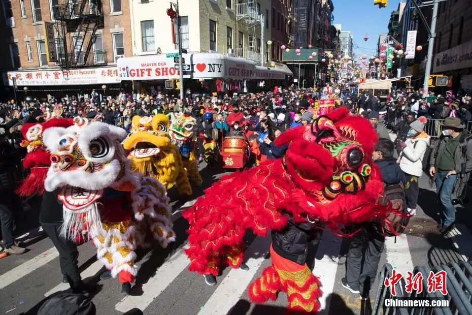 资料图:当地时间2022年2月20日,美国纽约曼哈顿唐人街举行新春爱心大游行,数万民众在唐人街参与游行欢庆新春。