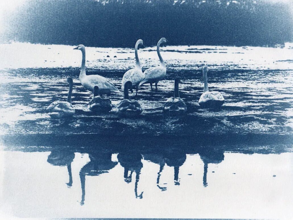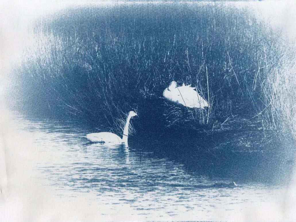 我的这组作品之所以用蓝晒工艺,是因为蓝色是永恒的象征,它表达的是美丽、安祥与纯洁,就像天鹅对待爱情一样永恒,坚贞。