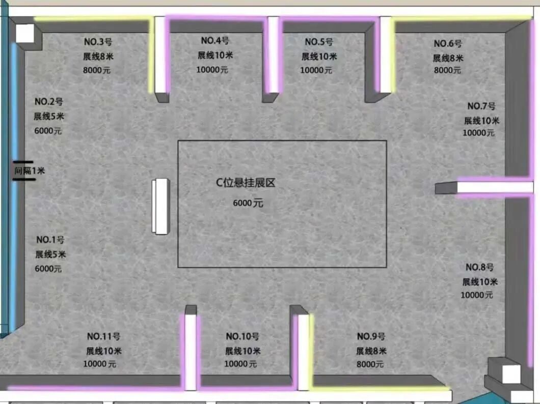 4.展位分布摄影作品展位11个,C位悬挂展区。(图中展位费为原价格,在此基础上8折)