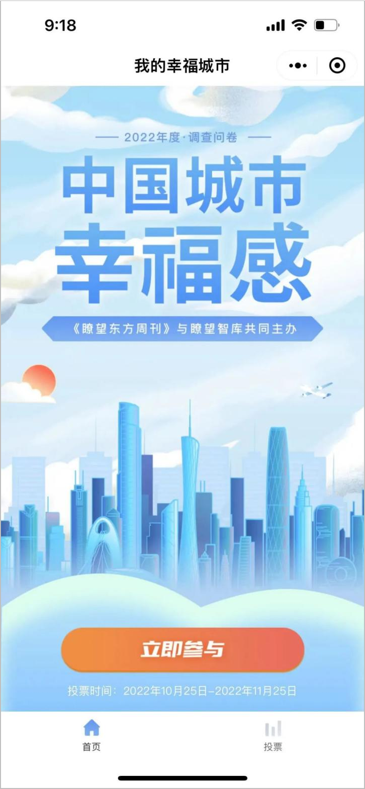 2.进入“我的幸福城市”调查问卷活动界面后,点击“立即参与”按钮;Enter the "My Happy City" questionnaire activity interface, and then click "Participate Now".![]()