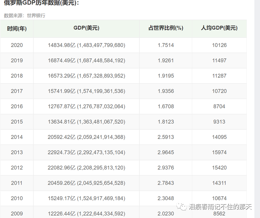 可以看到10-13年俄罗斯GDP飙升,14年由于受到制裁,下跌超过了10%。