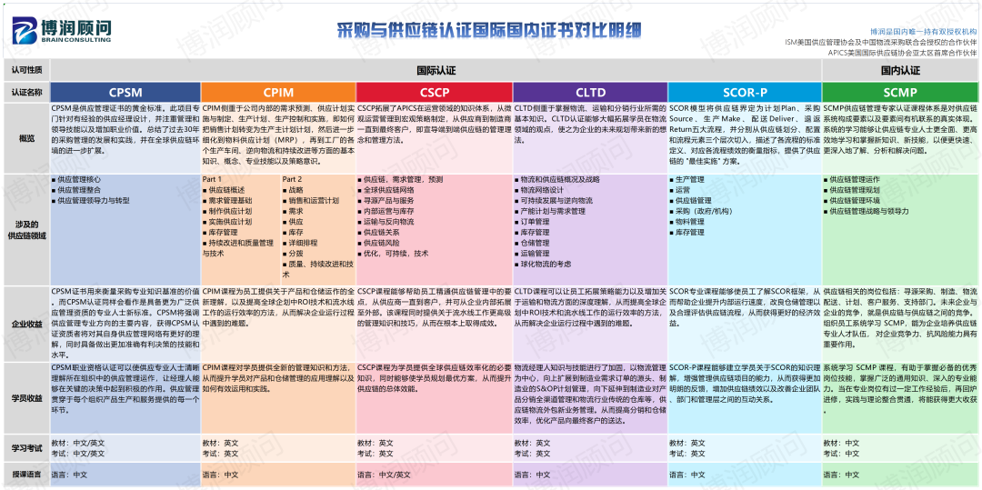 博润公司成立于2002年。专注于传播国际前沿的采购与供应链管理理念和实践,致力于为企业和供应管理人士提供专业的采购与供应链知识、体系和先进企业的成功案例,从而帮助企业实现采购供应链竞争优势和个人能力的全面提升。主要培训及服务项目:CPSM、CSCP、CPIM、CLTD、SCOR-P、SCMP采购与供应链培训,生产运营及物流管理相关培训课程;行业活动:行业研讨会,标杆学习,经验交流。博润凭借着完善的课程体系和丰富的教学经验和丰富的师资团队,结合客户需求,提供专业的解决方案。公司成立二十年来,服务过数千家的企业和数以万计的采购与供应链人士,并在2020年及2021年评为最佳推广CPSM&SCMP优秀机构。