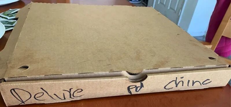 披萨盒上写着带有侮辱华裔的「Chinc」一词。(Linda提供)
