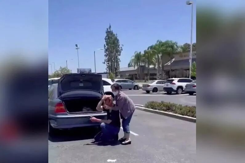 被害人一男一女推着超市购物车往自己的车走去。(视频截图)