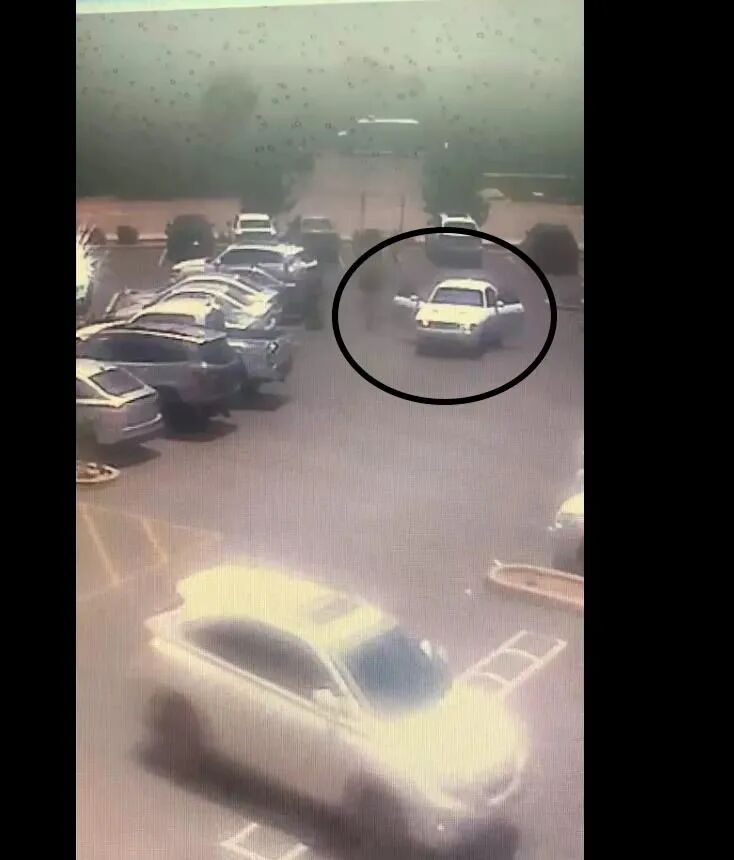 一辆等候多时的白色道奇车(Dodge Challenger)上冲下来两名歹徒。(视频截图)