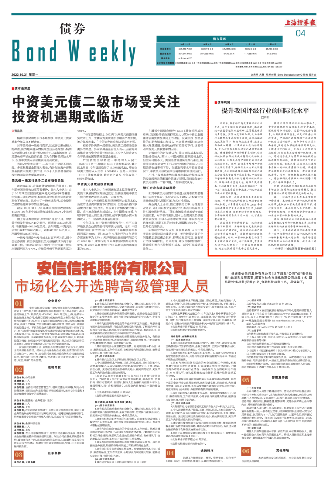 其一,鼓励中资企业在离岸市场发行债券时,主动使用中资评级机构的评级结果,建议在中资美元债备案环节,通过监管引导,要求发行人至少选聘一家中资评级机构,向境外投资者传递更多的来自中资评级机构的观点。