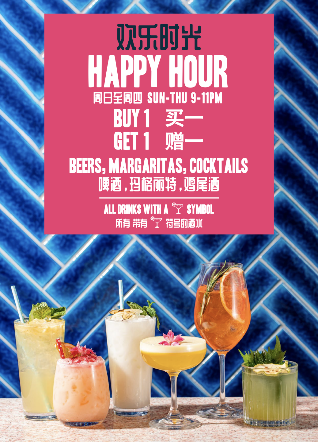 欢乐时光也全面升级了!每周日至周四的9点-11点,正是喝一杯的好时候。凡是标着可爱小标签的啤酒,玛格丽特和鸡尾酒,全部参与买一赠一活动。