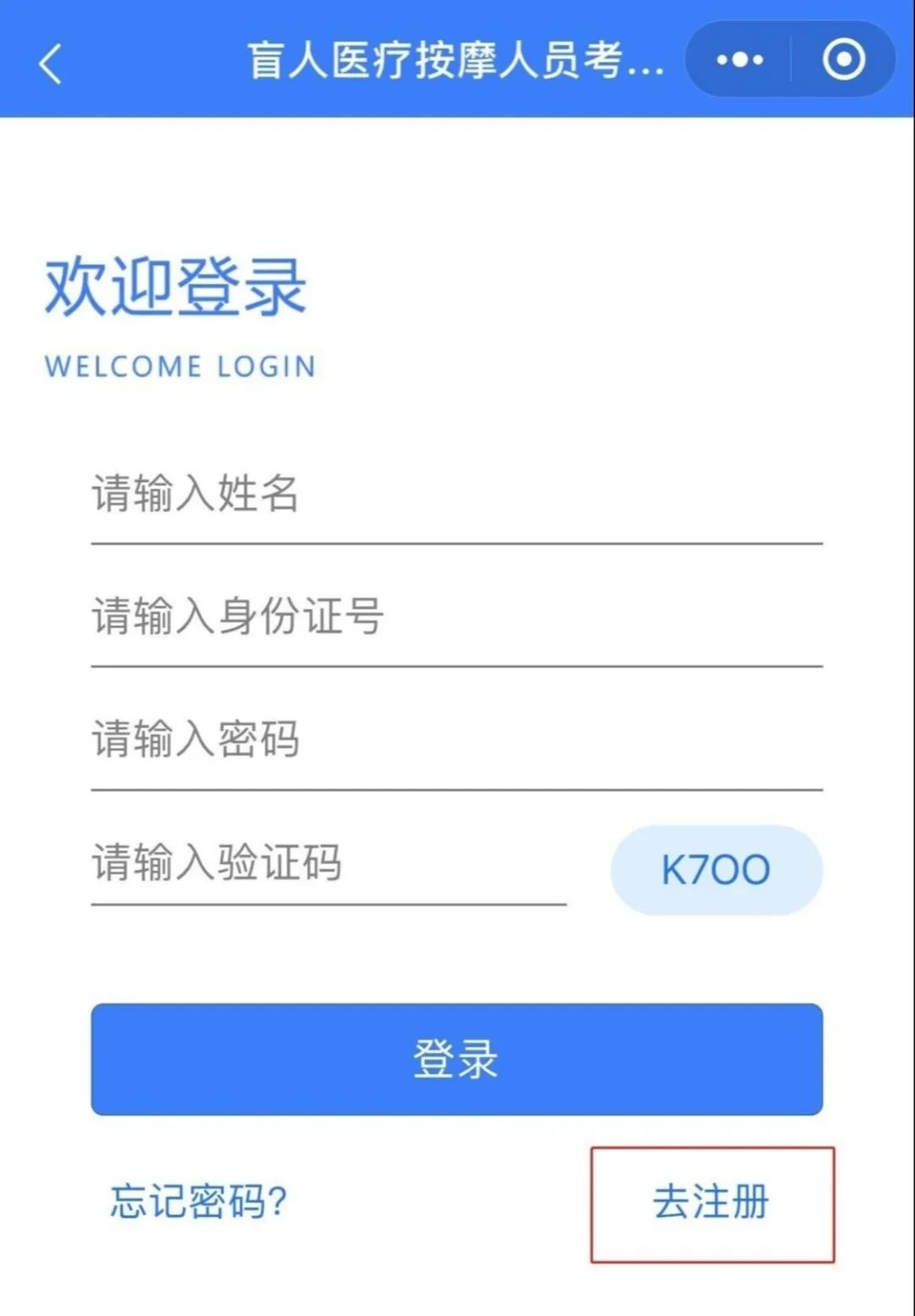 打开手机微信,扫描下方二维码或搜索“盲人医疗按摩人员考试服务系统”,选择小程序,点击进入注册报名。