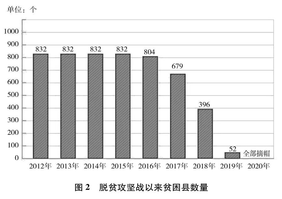 中共十八大以来,经过8年持续奋斗,到2020年底,中国如期完成新时代脱贫攻坚目标任务,现行标准下9899万农村贫困人口全部脱贫(图1),832个贫困县全部摘帽(图2),12.8万个贫困村全部出列,区域性整体贫困得到解决,完成消除绝对贫困的艰巨任务。