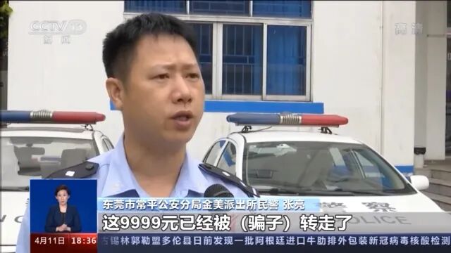 东莞常平公安分局金美派出所民警 张亮:马上叫她挂失之后,15万没有被转走。另外一张卡没有挂失之前里面有9999元,被(骗子)转走了。