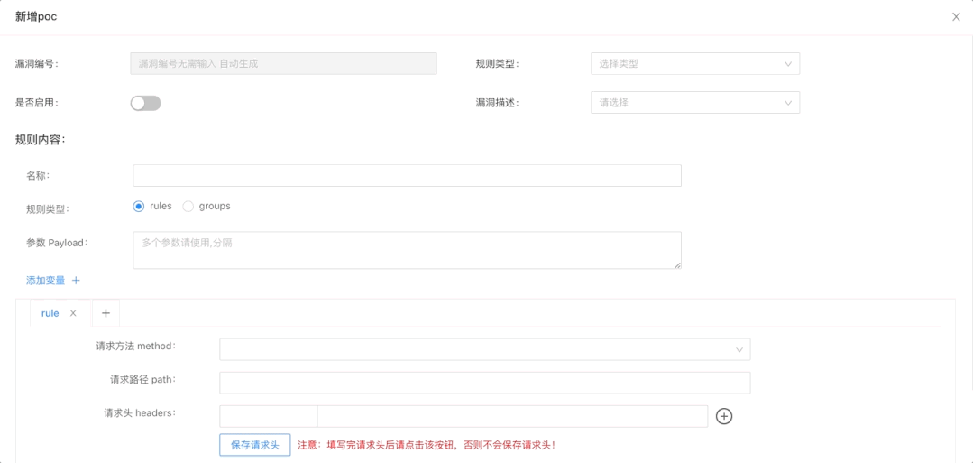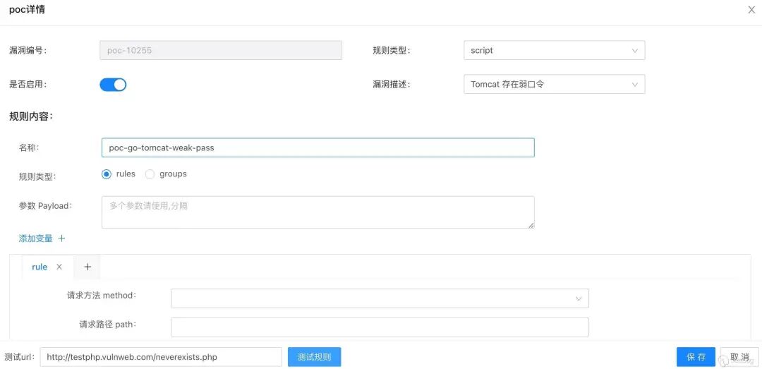 规则类型。规则类型将直接决定 rule 如何对原始请求变形。config.yaml中设置burpsuite代理:proxy: "127.0.0.1:8080"原始请求路径 + "/" + 规则中定义的path。host:port/。因此变形后的请求路径为host:port/+规则定义的path,请求头、请求body均使用规则定义。https://jweny.top/aaa/bbb.cc.php ,规则中定义的path为 /user/zs.php?do=save规则运行时变形的请求为https://jweny.top/user/zs.php?do=save。query string和post body 中的form data(json解析已在计划中)。参数级漏洞检测只需要在前端配置payload列表,pocassist 将依次将每个参数根据payload列表进行变形。appendparam 在原参数值后面拼接payload,例如检测带回显的sql报错注入。replaceparam 将原参数直接替换为payload?aaa=bbb&ccc=ddd,payload为' / %2527。appendparam将那么poc运行时会依次发四个请求:?aaa=bbb'&ccc=ddd?aaa=bbb%2327&ccc=ddd?aaa=bbb?ccc=ddd'?aaa=bbb?ccc=ddd%2327?aaa=bbb&ccc=ddd。// tomcat 弱口令