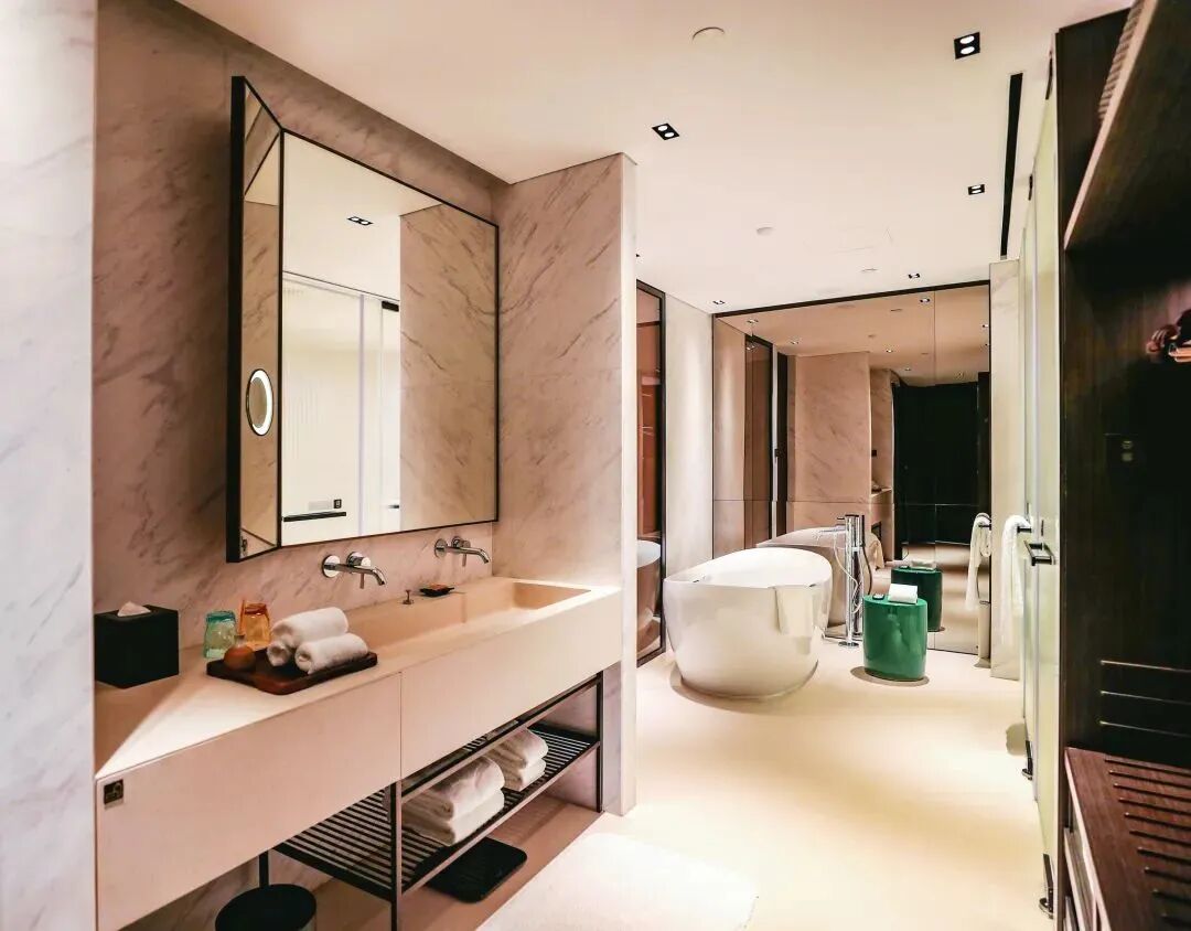 与朋友入住的是行政套房,客房内装修有工业风立体的线条和深颜色的木制家具,搭配浅色的布艺,让人想起小时候掏鸟窝时横七竖八树枝搭成的坚固鸟窝里那柔软的一层窝底,软软的,正好守护住一片温暖。坐在窗前,想像着如果带着宝贝们来,一排小脑袋一定会搭在沙发沿上撅着屁股向外看,各色各形的灯光抽象了这个夜晚,让窗外的景色像万花筒一样给孩子们惊喜。