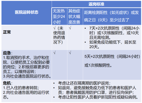 阳性医护人员返岗标准通常是根据医院运转状态而决定。医院运转状态主要分为正常、应急和危机状态。