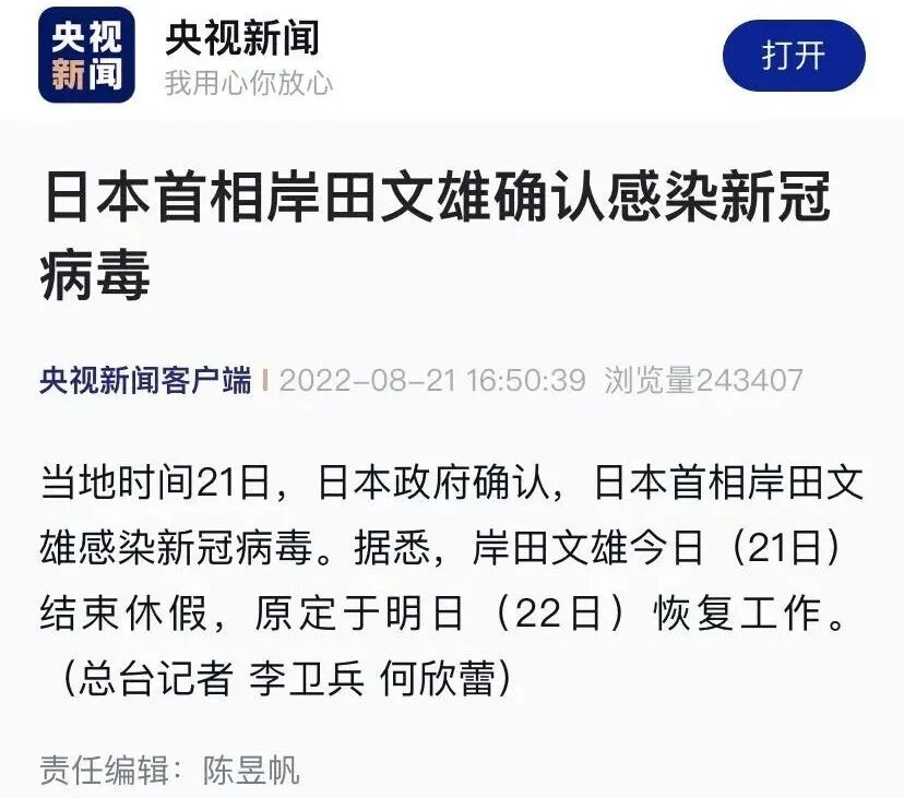 另据央视新闻客户端报道:日本富士新闻网21日消息,岸田文雄当日结束休假,原定于22日恢复工作。