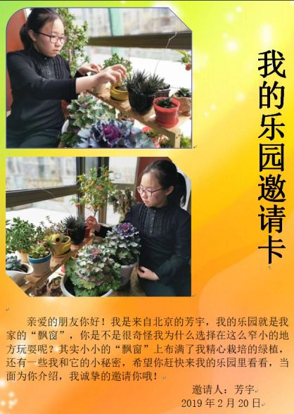 创意延伸: 同学们!下面这是一个同学做的乐园“邀请卡”,她附上了自己的乐园图片,并且简单地描述了她的乐园,希望大家伙儿去她的乐园里看看呢。等你们参观后,再将乐园的样子转述给其他同学,为他们做介绍。 看了芳宇同学制作的乐园邀请卡,你是不是也动心了呢?其实你还可以采用其他的方式为让更多的小伙伴看到你的乐园,比如录制小视频、撰写微博等,然后“声传声”“人传人”……你会收获意想不到的惊喜哦!