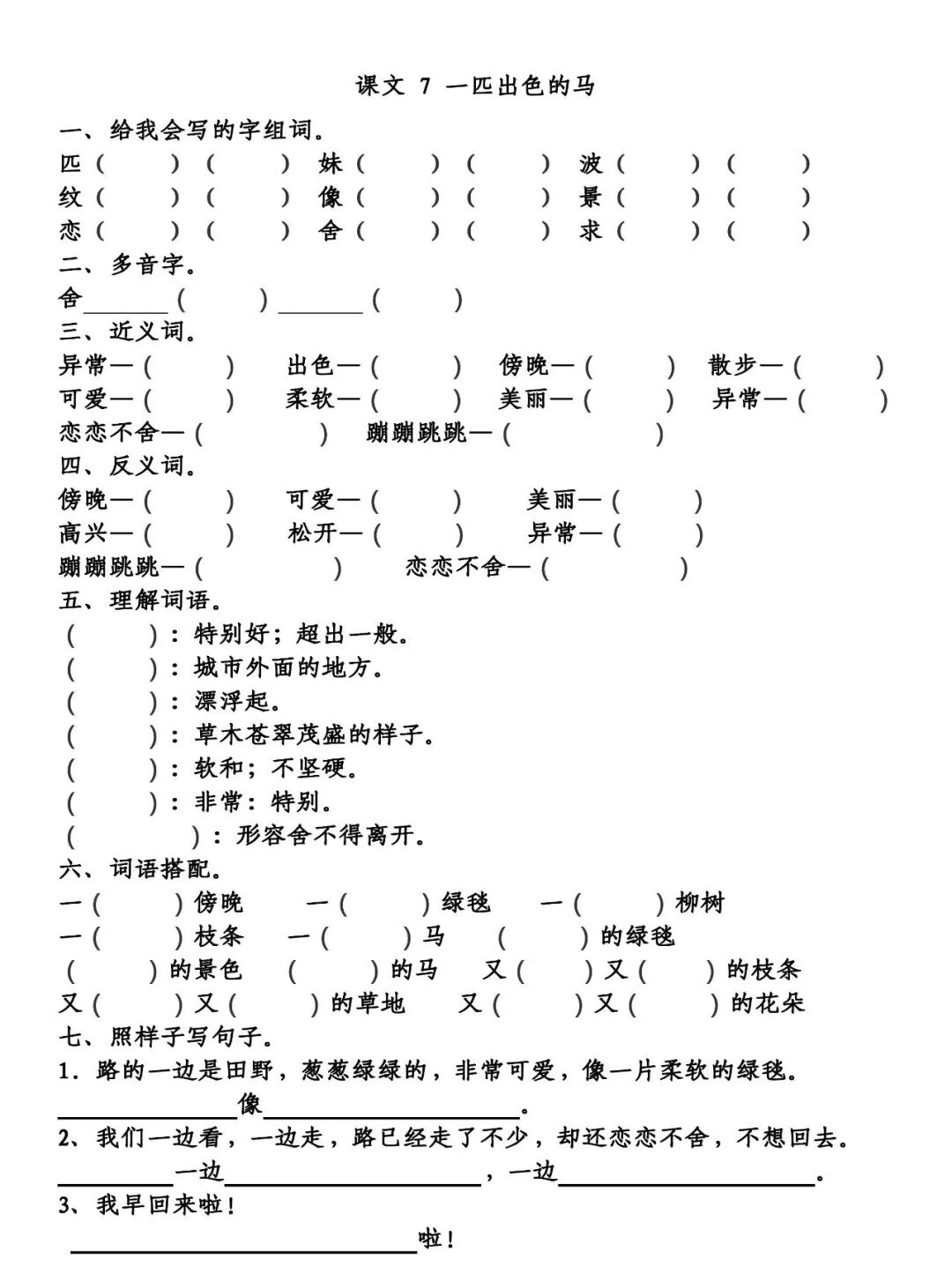 恋恋不舍—扬长而去五、理解词语 出色:特别好;超出一般。 郊外:城市外面的地方。 泛起:漂浮起。 葱葱:草木苍翠茂盛的样子。 柔软:软和;不坚硬。 异常:非常:特别。 恋恋不舍:形容舍不得离开。 六、词语搭配 一个傍晚 一片绿毯 一株柳树 一根枝条 一匹马 柔软的绿毯 美丽的景色 出色的马 又长又细的枝条 又(绿)又(软)的草地
