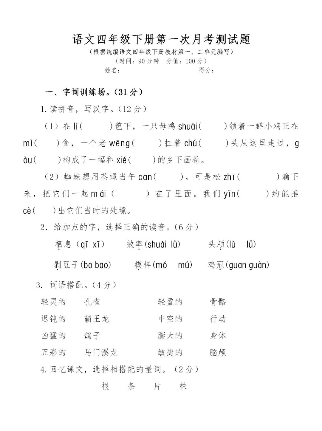 统编版语文四年级(下册)第一次月考测试卷(含答案)