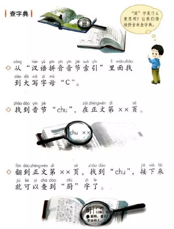 | 《语文园地三》 (1)查字典 我能用音序查字法查字典: 如查“厨”这个字,从“汉语拼音音节索引”中找到大写字母“C”。找到“chu”,在正文第65页,翻到正文第65页,找到“chu”,接下来就可以查到“厨”字了。 根据这种方法,我能完成下面的表格。