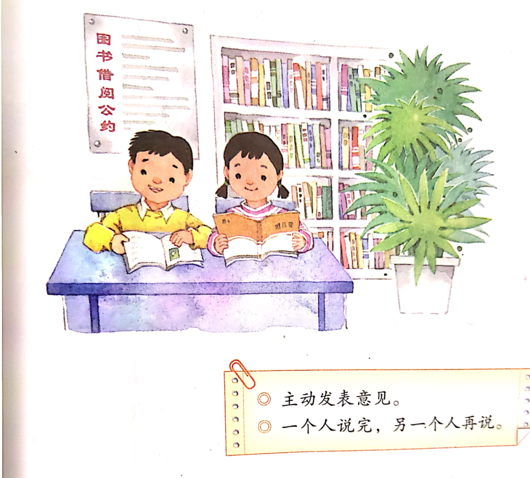 口语交际:图书借阅公约。 和同学讨论一下,班里的图书角应该怎样管理。如,怎样借阅图书,怎样爱护图书,怎样保证大家都能借到书。讨论的时候,注意听别人的意见。在小组讨论的基础上,形成班级的“图书借阅公约”,张贴在班里的图书角。