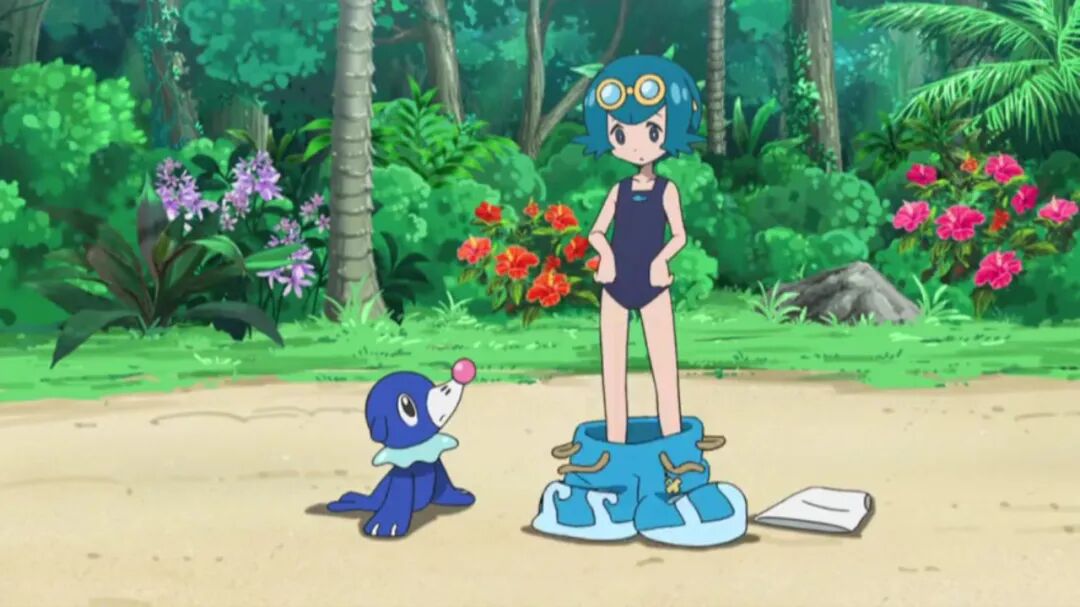 水莲是渔民家孩子,很喜欢游泳,也很喜欢水系宝可梦。她的衣服里面就是泳装,脱掉后随时可以游泳,类似日本学生的死库水。