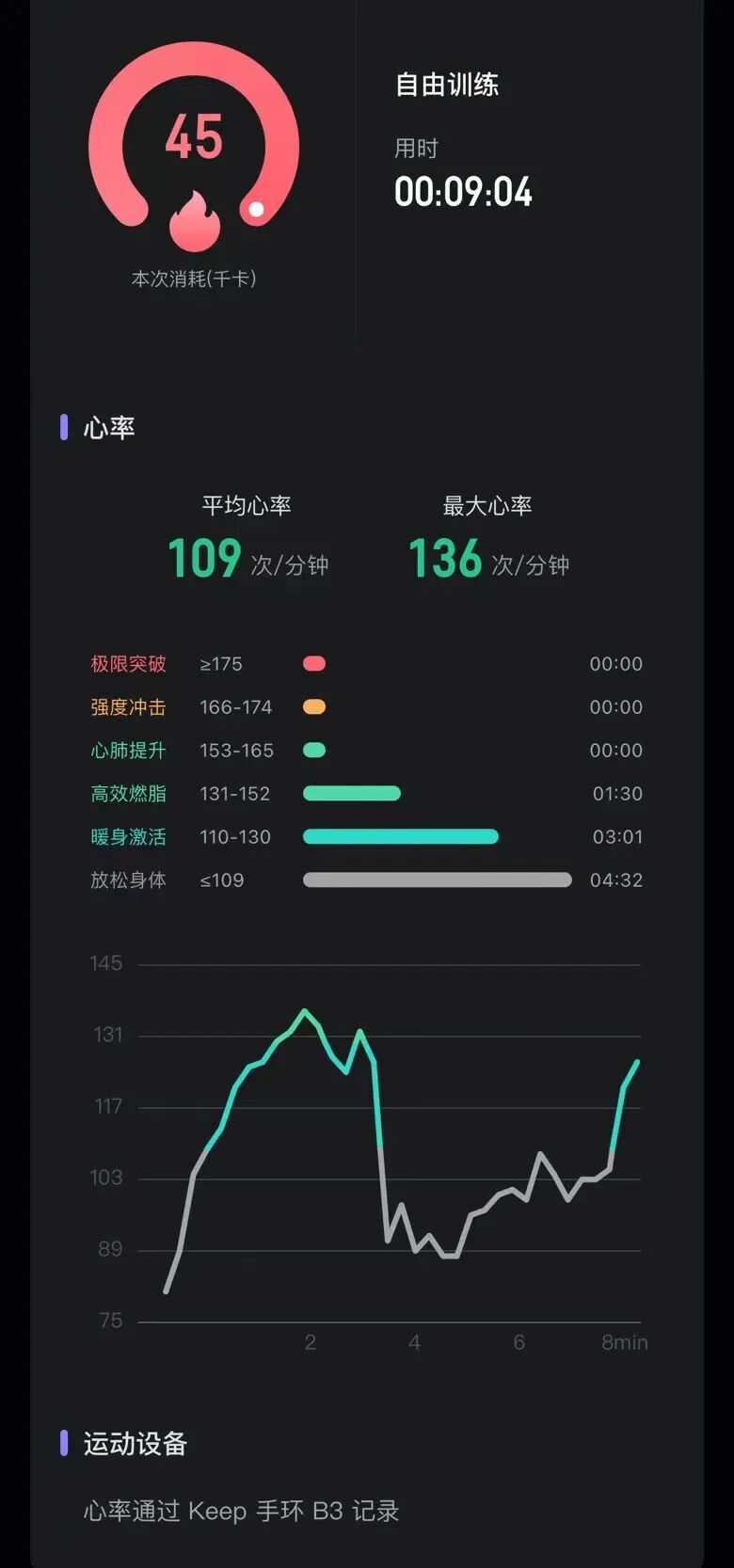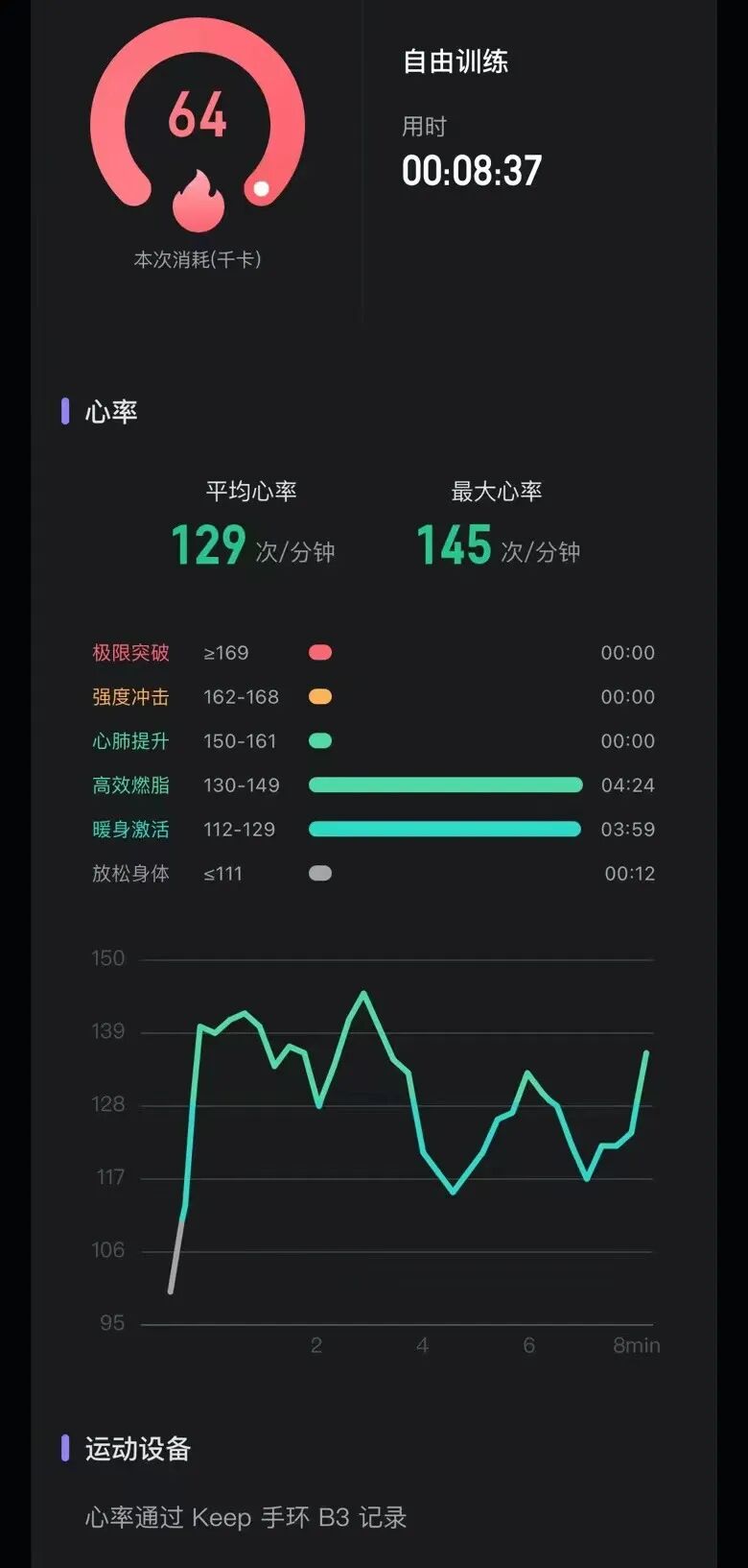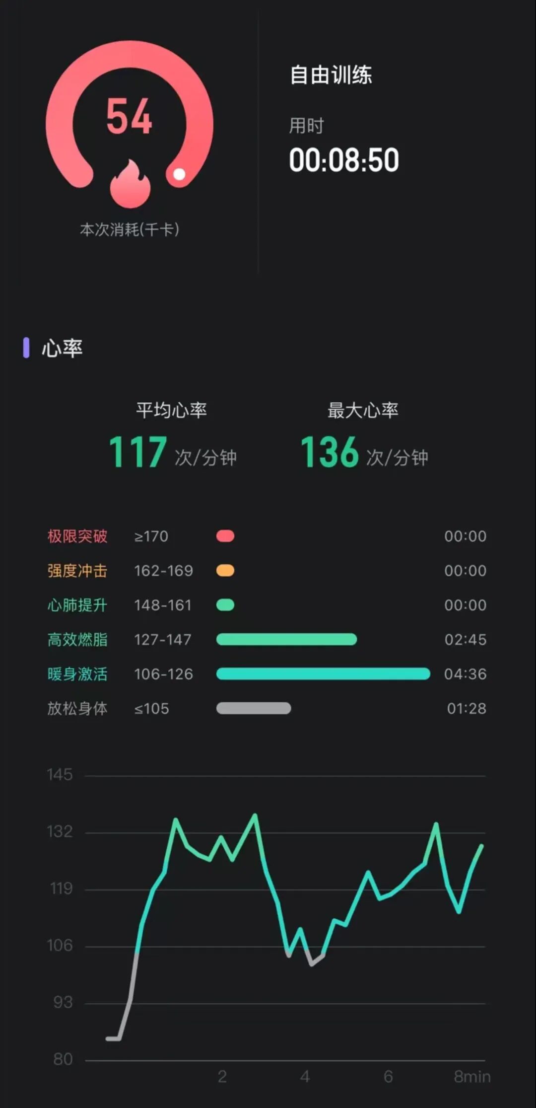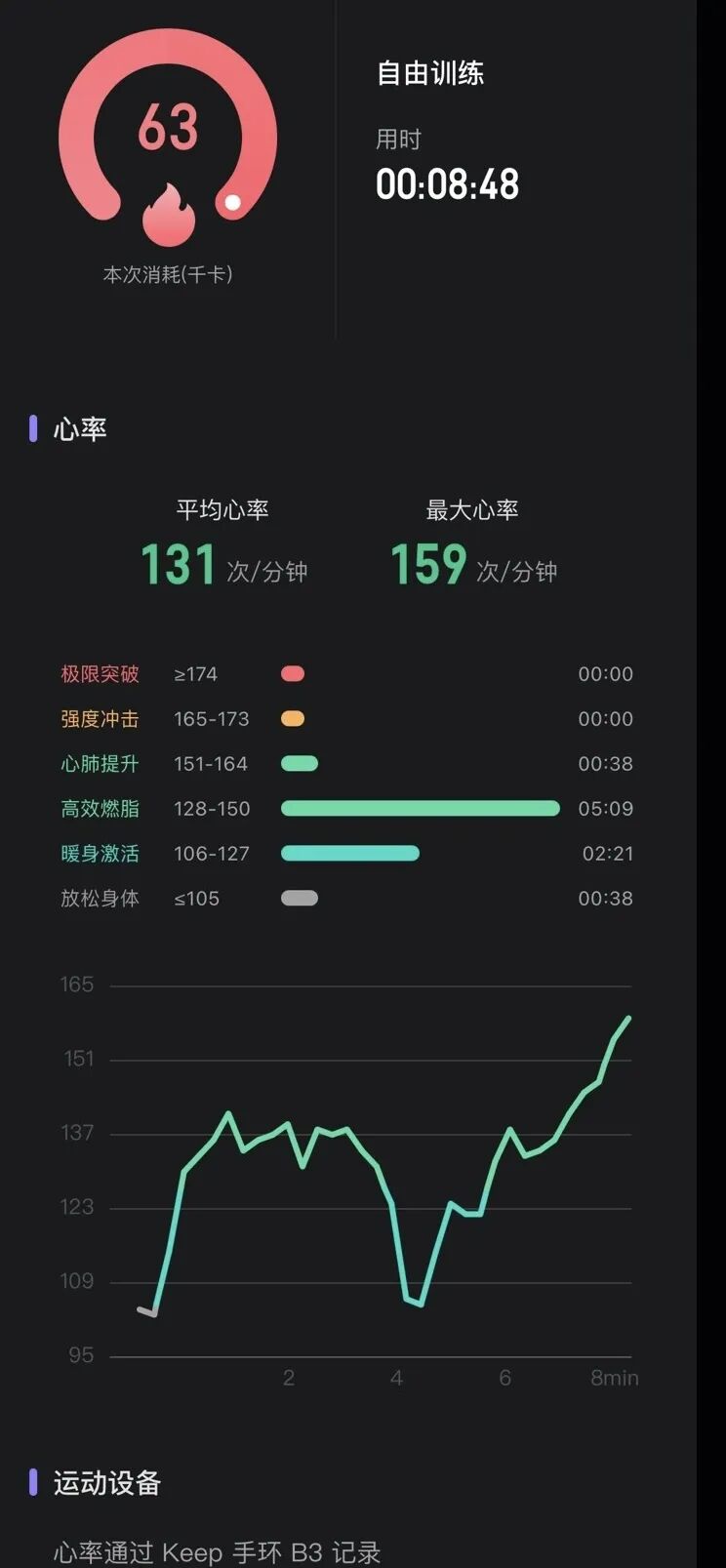 两套操做完之后,几个同事的卡路里消耗和心率波动如下⬇️。可以看到在短短 8 分钟的训练中,大家都或长或短的达到了自己的燃脂区间。