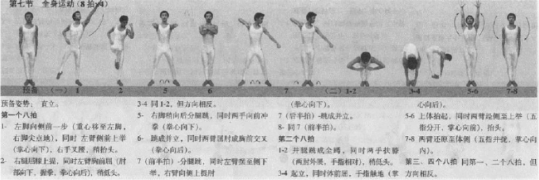 短短两个 8 拍里,和着音乐节奏,涵盖了 12 个步骤,完成:抬臂胸前屈、分腿跳、开合跳、下蹲起立、体前屈、双臂上举等一系列动作。