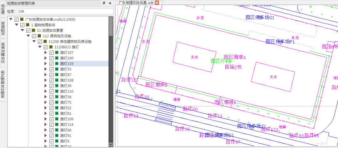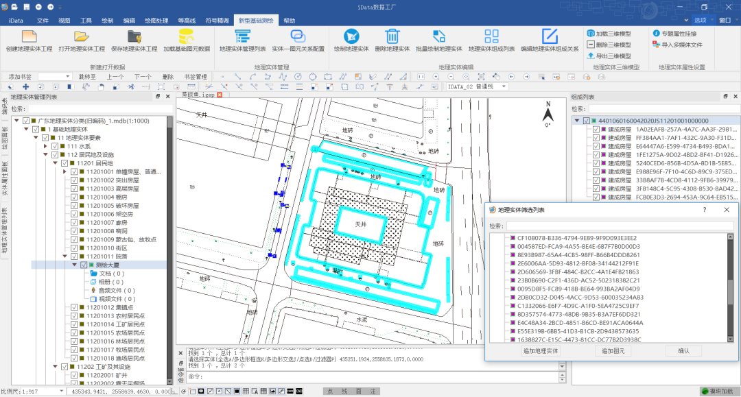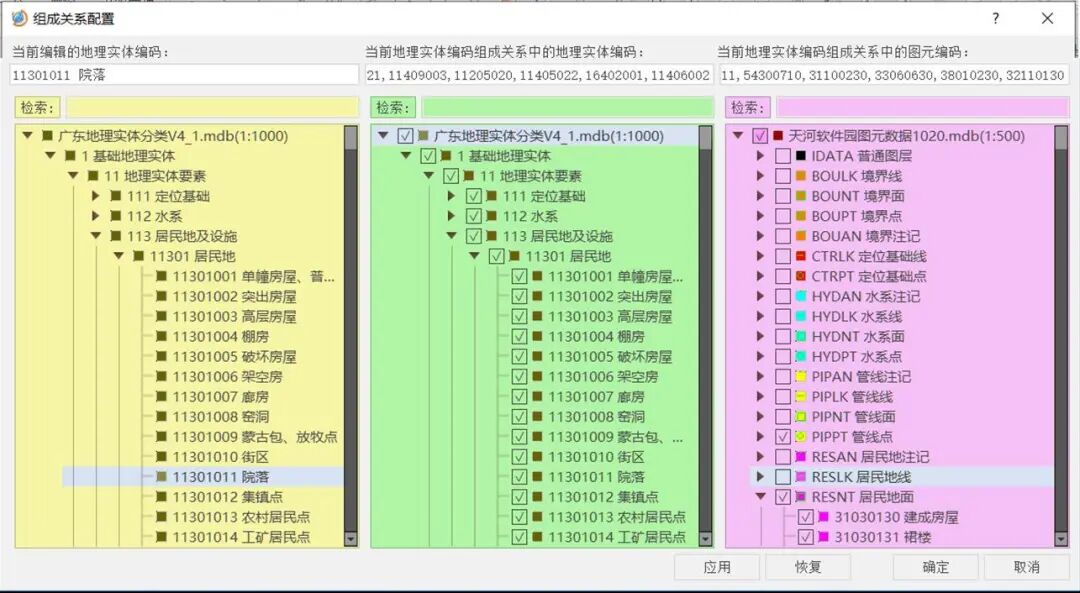 地理实体与图元关系配置。地理实体的构建,可通过增加自动判断、筛选来简化人工作业的操作,降低人为判断的失误。软件支持地理实体-图元组成关系的配置,在实体构建之前,明确定义实体可能包含的图元、子实体类型;在实体构建时,软件通过组成关系配置自动对人工在图面框选的实体、图元进行筛选,排除错误数据。此外,用户还可定义拓扑筛选规则,属性筛选规则来辅助构建。