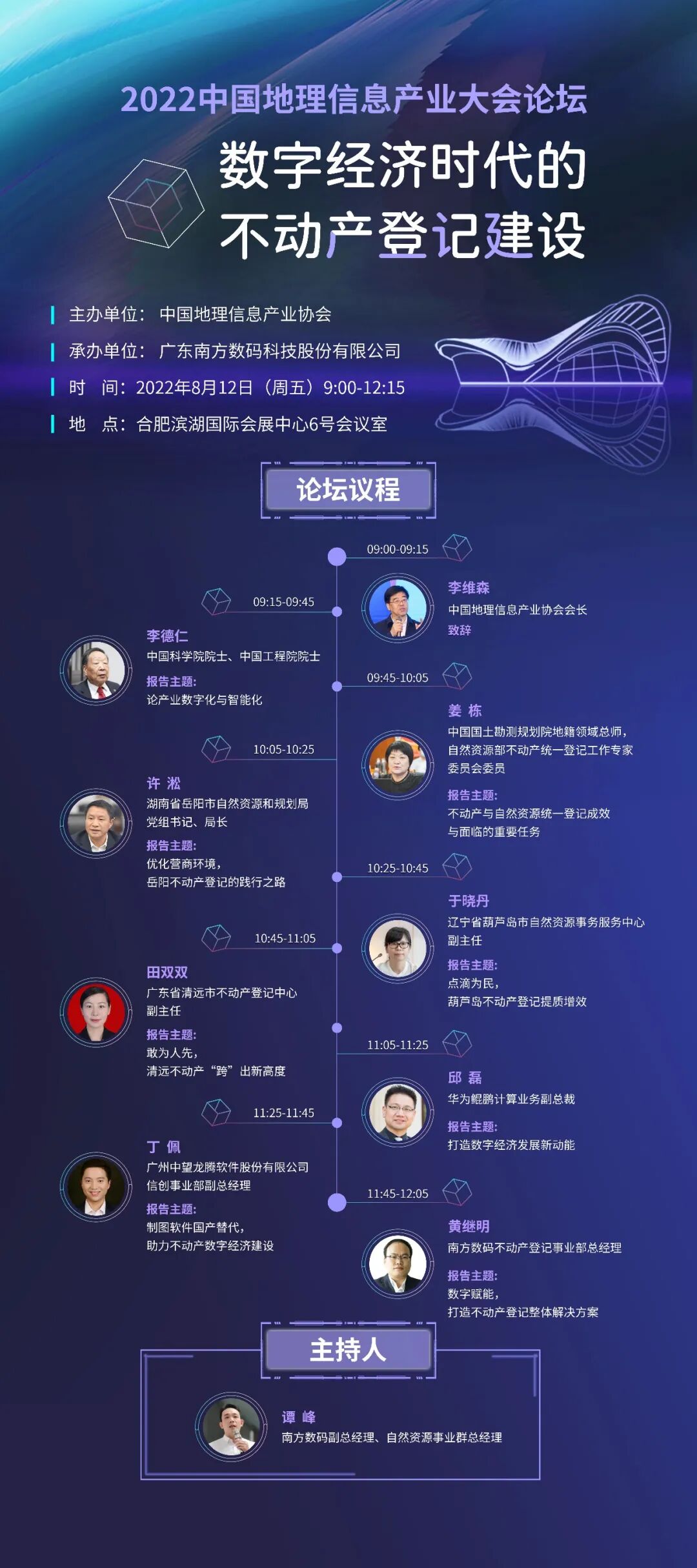 8月12日(周五)上午9:00-12:15,由中国地理信息产业协会主办、南方数码承办的专题论坛“数字经济时代的不动产登记建设”将在合肥滨湖国际会展中心6号会议室举办。
