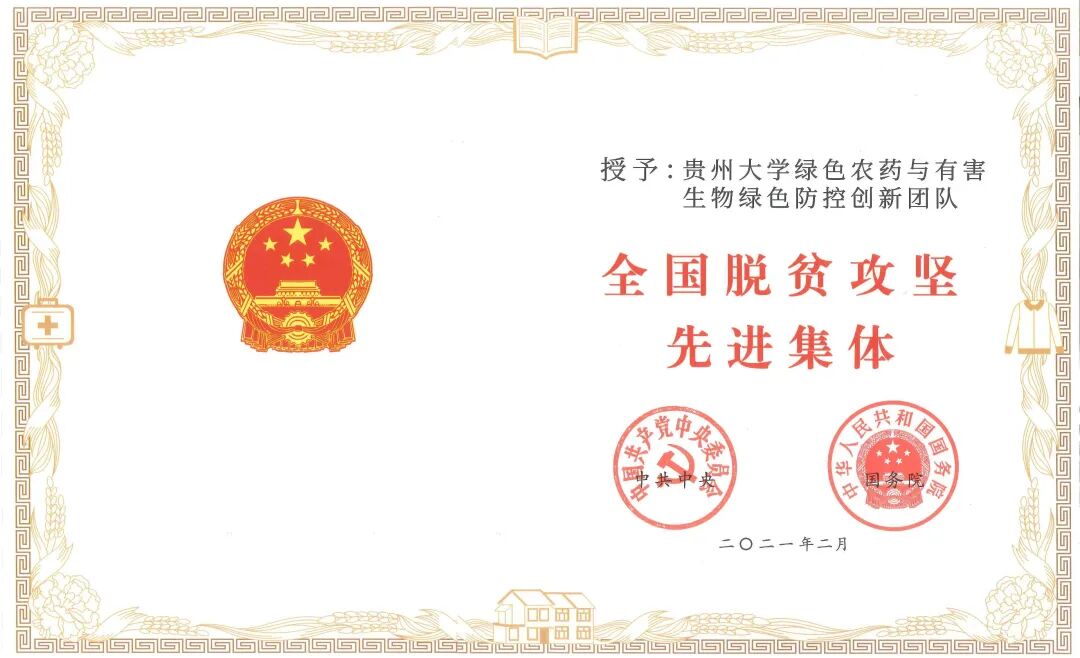 同时,团队组建了茶、蔬菜和水稻等绿色防控技术团队赴基层,创建出“博士村长”计划,在46个县和300余贫困乡镇开展产业扶贫,有效支撑了贵州特色优势作物的绿色发展。该举措获贵州省委书记点赞,受人民日报、央视新闻联播和光明日报头版头条多次宣传报道。相关工作先后两次入选教育部省属高校精准扶贫精准脱贫典型,并荣获 “全国专业技术人才集体”“全国教育系统先进集体”“全国脱贫攻坚先进集体”等荣誉称号。