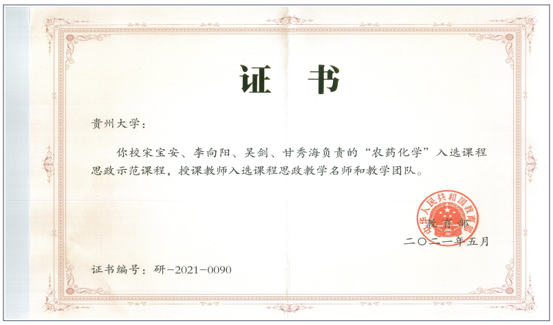 今年2月,教育部公布了第二批“全国高校黄大年式教师团队”,我校绿色农药与有害生物绿色防控教师团队入选。该教师团队由贵州大学校长宋宝安院士于1990年创建,他带领团队几十年如一日,在贵州实现了博士点、国家重点学科和世界一流建设学科等多个贵州科教指标零的突破,为国家农药行业科技进步和贵州经济社会发展作出了重要贡献。