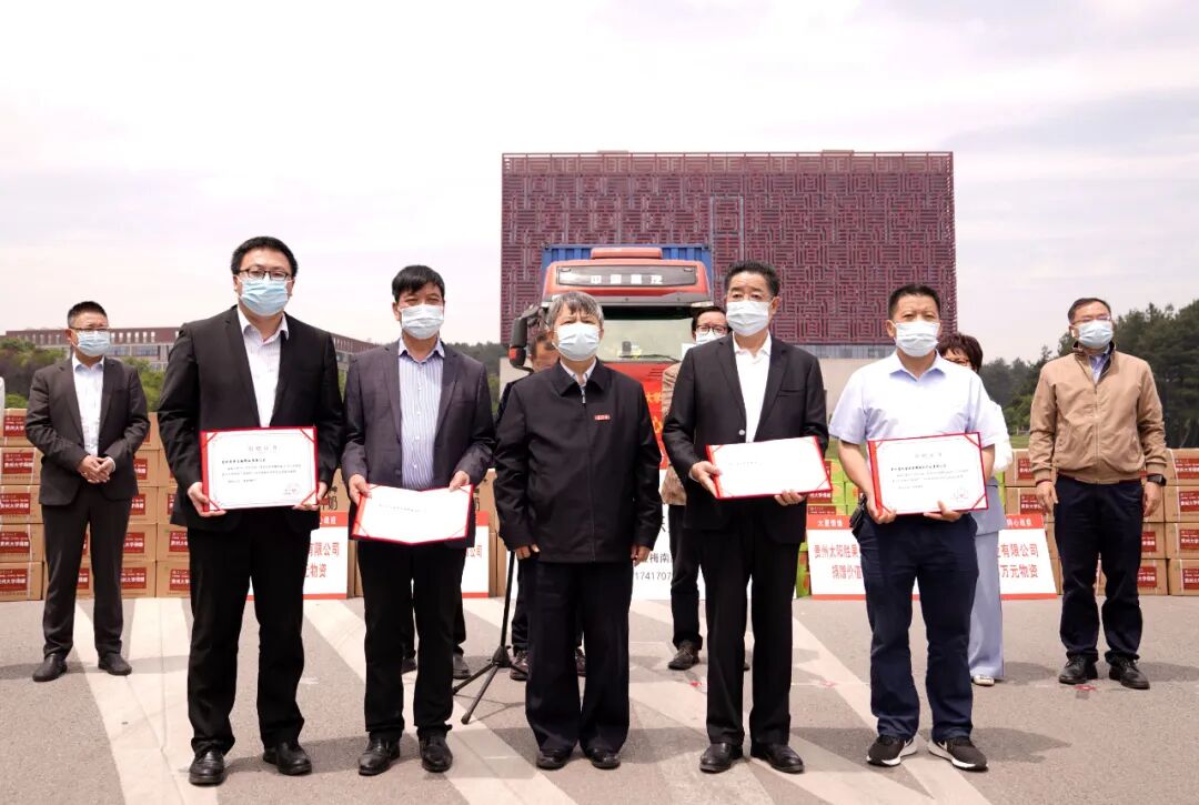 此次抗疫物资捐赠,得到了贵州太阳胜果生物科技有限公司、贵州省织金县农耀农业开发有限公司、贵州南方乳业有限公司、贵州奇昂生物科技有限公司的大力支持。捐赠仪式上,校长宋宝安院士向捐赠企业家代表颁发捐赠证书,向他们表达感谢。