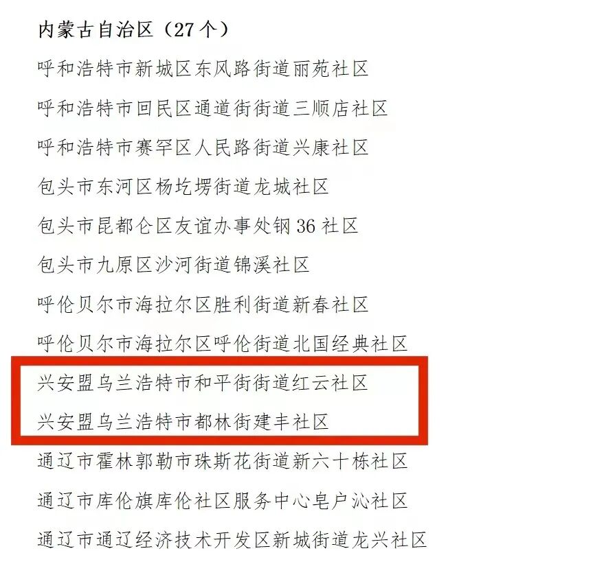 近日,国家卫生健康委、全国老龄办公布2022年全国示范性老年友好型社区名单,兴安盟乌兰浩特市和平街红云社区、都林街建丰社区被命名。