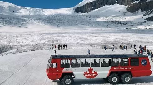 哥伦比亚冰原,这里可以乘坐着性能极佳的冰川全地形车,这种车有着巨大的轮胎,开上面积达2.3平方英里,足足有980英尺厚的阿萨巴斯卡冰川。