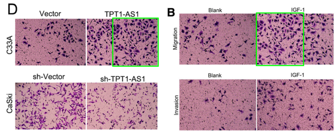 质疑点一:左图 Fig 2D(Long non-coding RNA TPT1-AS1 promotes cell growth and metastasis in cervical cancer via acting AS a sponge for miR-324-5p" (Jiang et al 2018))与右图Fig 8B图片相同。