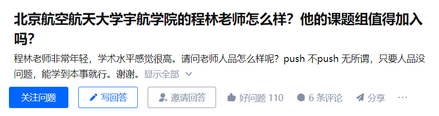 近日,一则『北京航空航天大学宇航学院的程林老师怎么样?他的课题组值得加入吗?』的提问引起了人们的关注,不仅引得导师亲自回答,还有北航学生调侃这是北航第一次以正面形象登上热搜。