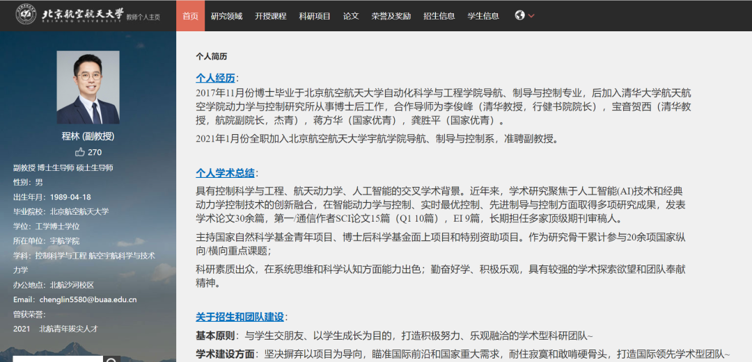 在个人介绍上,程林老师出生于1989年,本科就读于山东大学控制科学与工程学院的自动化学院,后考入北航自动化学院读研,2017年博士毕业后进入清华大学航空学院攻读博士后,2021年博后出站后回到北航任教,担任副教授,可谓是年轻又有实力。