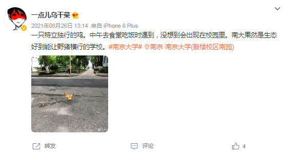 甚至还有人在去食堂的路上,拍到过一只小鸡在路边悠闲的散步。
