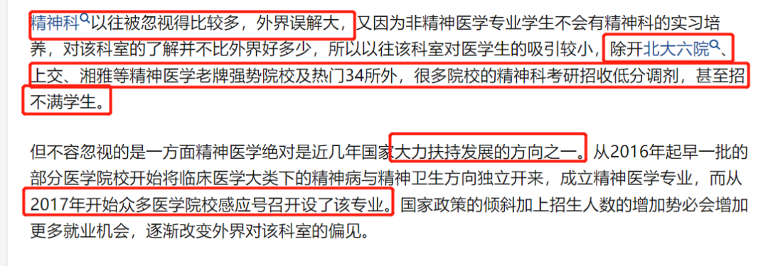 相比于世界领先高校,国内精神医学学科发展还十分滞后。2016年后,经国家政策调整,将精神医学独立发展,虽然有国家扶植,但是学科仍然面临着有专业无人报考的窘境。