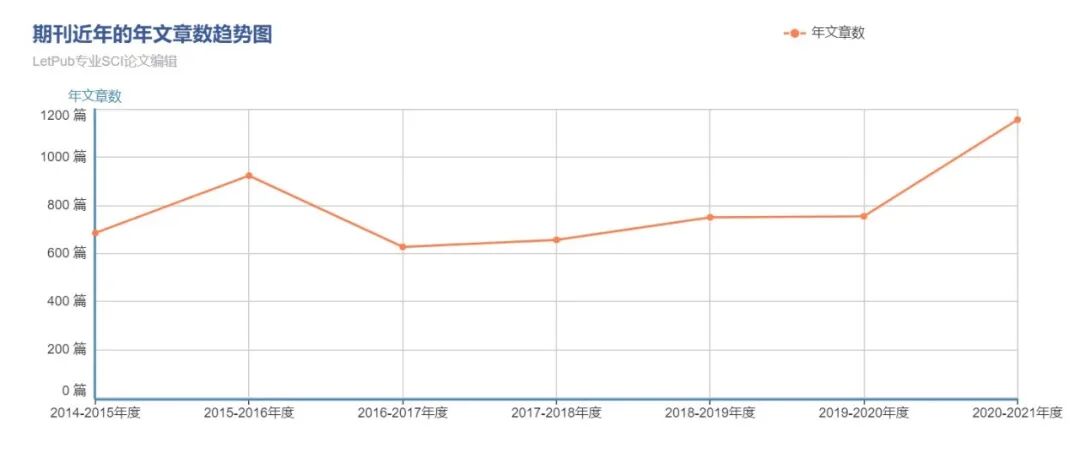 期刊近五年发文量如图所示,2020年共发文1157篇,其中包含原始研究974篇,综述183篇。相较于2019年发文755篇,年发文量增长约53%,体现期刊近年对研究学者较为友好。