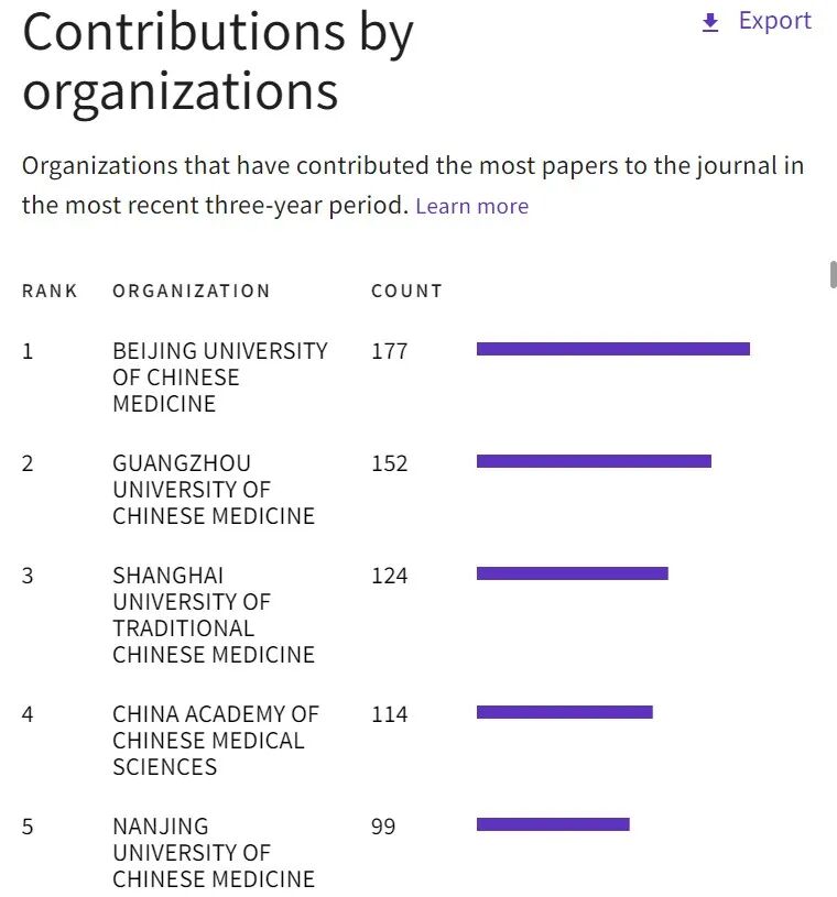 近三年期刊发文量排行前五甲的高校和科研院所分别为北京中医药大学(177篇),广州中医药大学(152篇),上海中医药大学(124篇),中国中医科学院(114篇)和南京中医药大学(99篇)。前五名全部为我国高校,可以体现出期刊十分欢迎我国科研学者投稿。