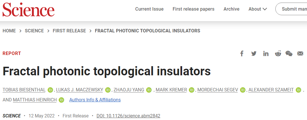 2022年5月12日,罗斯托克大学Matthias Heinrich,Alexander Szameit及浙江大学杨兆举共同通讯在Science 在线发表题为“Fractal photonic topological insulators”的研究论文,该研究探索了基于完全由边缘站点组成的精确分形的分形拓扑绝缘体。