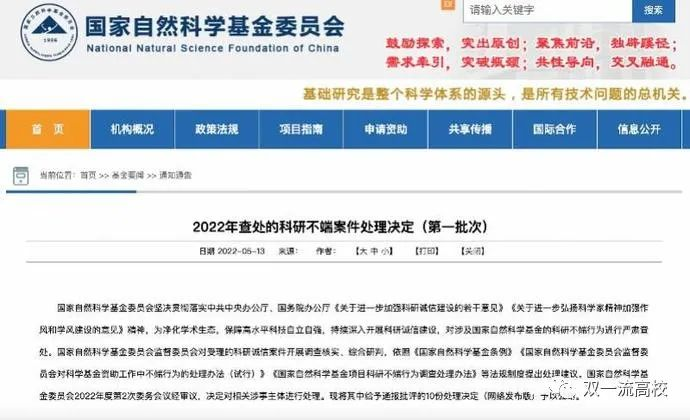 5月13日上午,国家自然科学基金委员会官网发布了《2022年查处的科研不端案件处理决定(第一批次)》